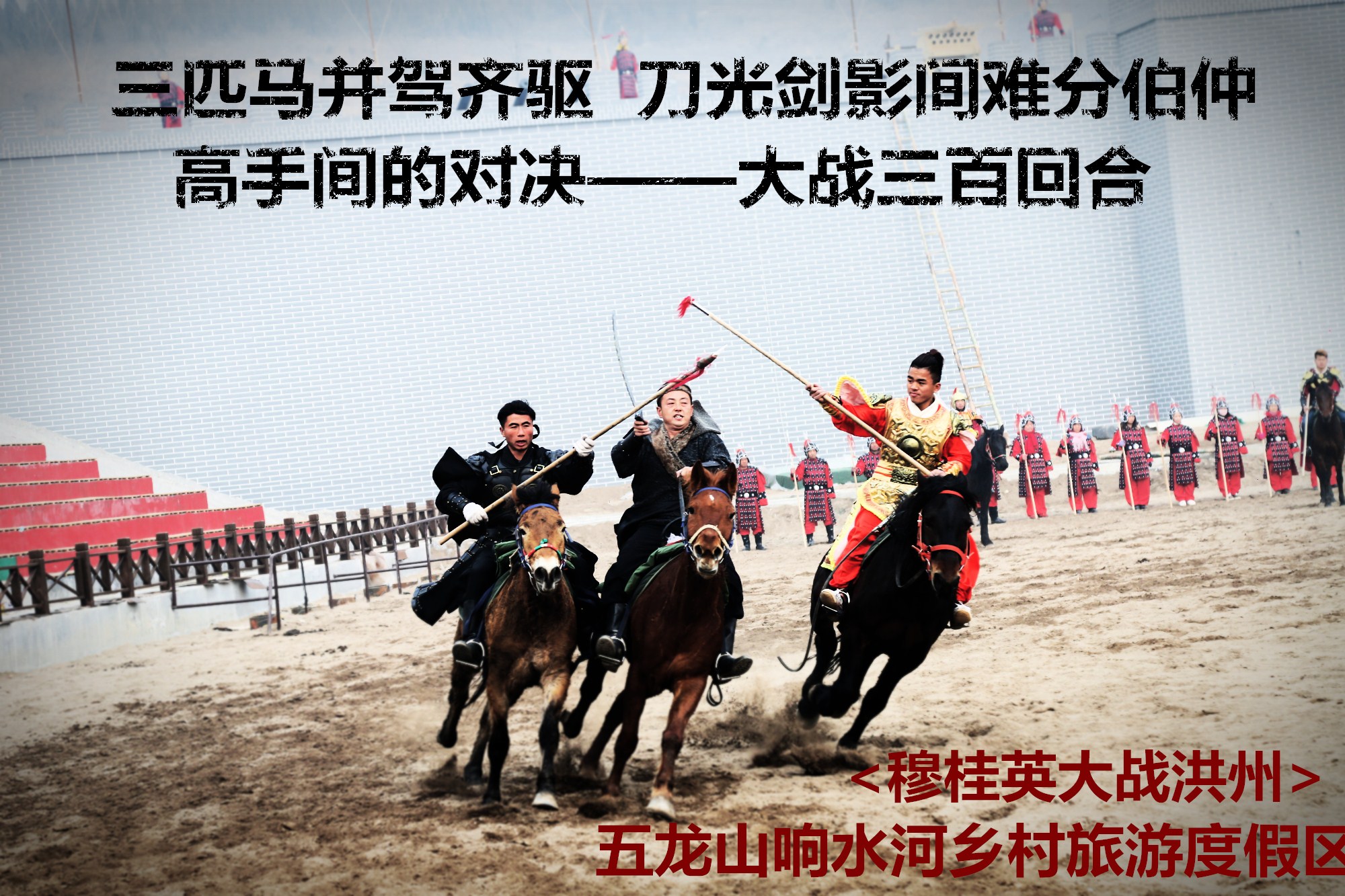 这是迄今为止豫北首个大型古代马战场实景剧。本次马战仿真古代真实马战场面,剧场由五龙山响水河旅游区投入2200万巨资精心打造。演出中,“炮火、攻城、马战、特技、战鼓、杀敌”等多重场景,将缤纷上演,重现北宋末年大型实景战场情景,重现当年穆桂英挂帅出征抵御异族入侵的史诗巨制。